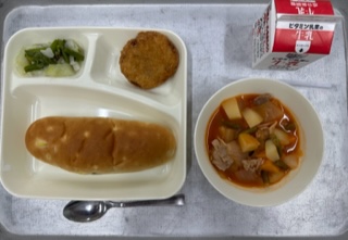 チキンレバーカツは、ほんのりカレー味がついて食べやすく、不足しがちな鉄をとることができる一品です。子どもたちは、サクッと揚がったカツを美味しそうに食べていました。ケチャップ煮にはたくさんの具が入っていて、食べ応えがありました。