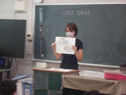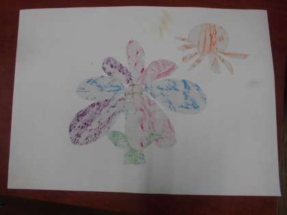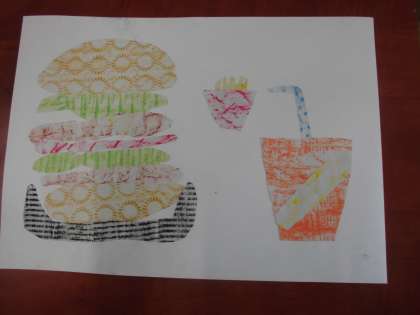 クレパスとなかよし! クレパスをもって紙を凸凹したものに擦りつけて模様をつけます。その紙を切っていろいろな形にしていきます。ハンバーガーやお城、お花など模様が絵にかわっていきました。