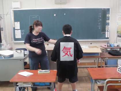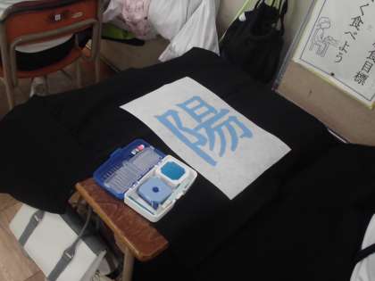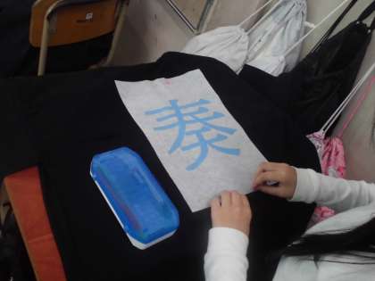 運動会で6年生が団体演技のソーラン節で着る衣装に、自分のお気に入りの漢字1文字を貼り付けました。衣装を着てみると気合十分です。かっこよく決めてほしいです。