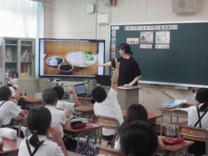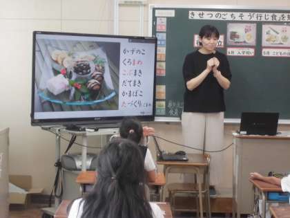4年生の教室で食育が行われました。今日のテーマは、「季節のごちそう行事食を知ろう」です。給食では1年間に様々な行事食が提供されます。それぞれの行事食には、人々の願いやおもいが込められて作られています。季節や行事に合わせたごちそうの意味について知ることができました。
