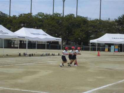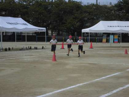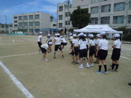 4年生が団体競技「台風の目」の練習を行いました。みんなで協力してコーンを回ったり、戻ってきてみんなの下に棒をくぐらせたり、忙しい競技です。「棒をもっと低くして!」などチームで声を掛け合う場面が見られました。