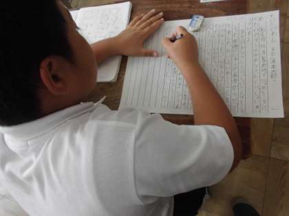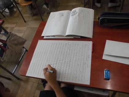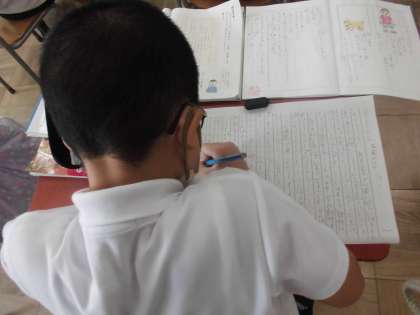 4年生の国語科では、「山場のある物語をかこう」の学習をしています。物語の構成や山場で大きな変化が起こることを考えて、今日はノートを見ながら実際に物語を書く学習をしています。みんな黙々と自分なりの物語を書いています。