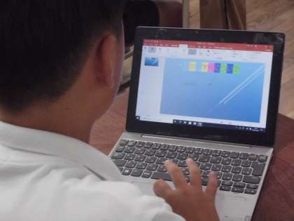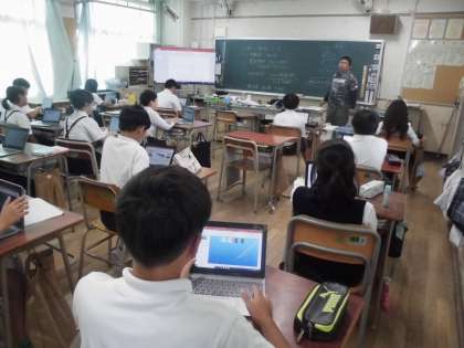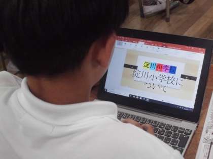 パソコンのパワーポイントを使って、淀川小学校の宣伝するプレゼンを作る練習をしました。子どもたちの操作を覚えるのは早いですね。いろいろな機能を使って作成することができました。