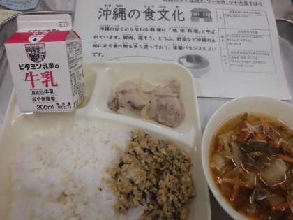今日の給食は、鶏肉のゆず塩焼き、ソーキ汁、ツナ大豆そぼろ、ごはん、牛乳です。今日は、沖縄の食文化についてお知らせします。沖縄の古くから伝わる料理は「琉球料理」と呼ばれています。豚肉、海藻、とうふ、野菜など沖縄の土地にある食べ物を多く使っており、栄養のバランスもよいです。今日の給食では、沖縄料理のソーキ汁です。