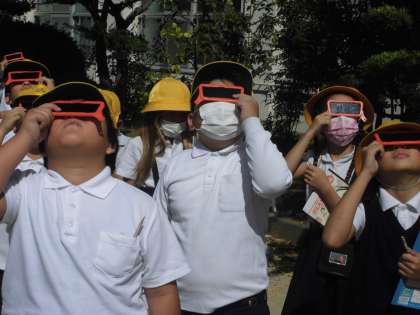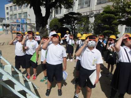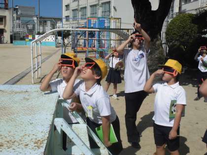 3年生の理科では、太陽とかげの関係を調べる学習です。目を傷めるので太陽を直接見てはいけないことを学習しました。今日はみんなで太陽グラスを使って太陽を見てみました。