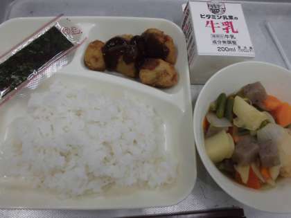 今日の給食は、味噌カツじゃがいもと野菜の煮もの、ごはん、焼きのり、牛乳です。今日の給食で出ているのりは、骨や歯を丈夫にするはたらきがあるカルシウムがふくまれています。また、食物せんい、鉄など、体に必要な栄養が多くふくまれています。のりは海藻のなかまです。