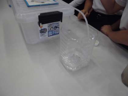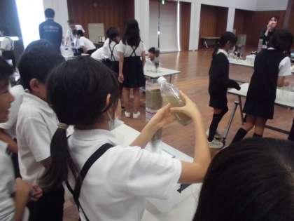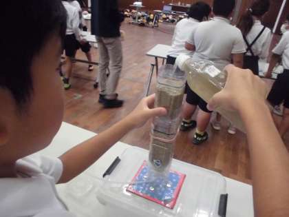 今度は実験です。「みんなも水をきれいにしてみよう!」砂ろ過装置を使って汚れた水をきれいにしていきます。