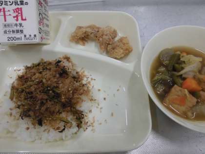 今日の給食は、鶏肉のたつたあげ、あつあげと野菜の煮物、おかか菜っ葉、ごはん、牛乳です。たつたあげは、魚や肉にしょうが汁、料理酒、こいくちしょうゆで下味をつけ、片栗粉をまぶして油であげた料理のことです。あげたときにしょうつの色が赤くなり、衣が白くうかぶ様子が、紅葉が流れる竜田川に見えることから「たつたあげ」の名がついたと言われています。