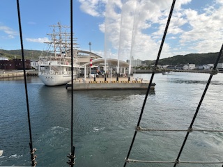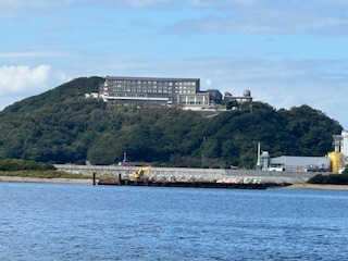 修学旅行2日目初めの活動は、うずしおクルーズです。咸臨丸に乗って福良港を出発しました。休暇村南淡路も見えます。