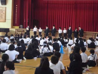今日の児童集会は、「みんなで解こうなぞなぞクイズ」です。グループみんなで考えないと、答えがわからないような難問ばかりです。朝から頭を使いました。その後は、新しく代表委員になった5年生が一人ずつあいさつをしました。