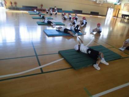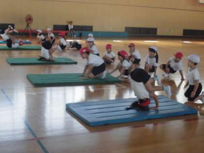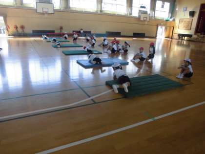 1組は、マット運動をしました。マットになれるために、全身1本の棒になって転がりました。前転や後転にも挑戦しました。