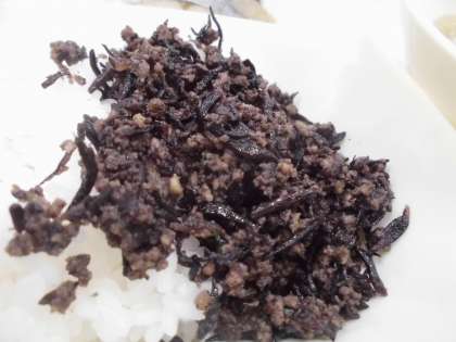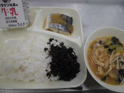 今日の給食は、さごしのみぞれかけ、みそ汁、牛ひじきそぼろ、ごはん、牛乳です。牛ひじきそぼろは、牛ひき肉とひじきをいため、甘辛く味つけし、しそを加えて風味を増します。しその香りには、食欲を増す働きがあります。ひじきとしそを使うことで、カルシウムや食物せんいをとることができます。
