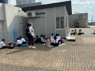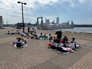 海遊館で沢山の生き物を見て、楽しい時間を過ごしました。次は海をみながら、仲良くお弁当を食べています。