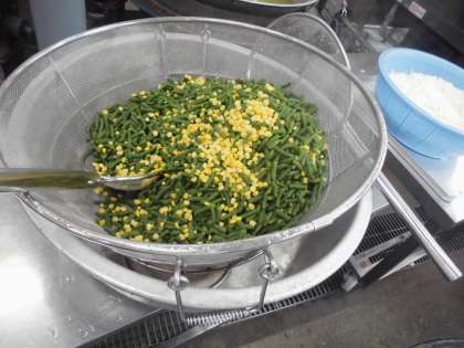 上の写真は、さんどまめとコーンのサラダが出来上がったものです。