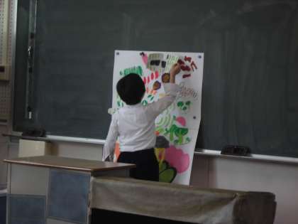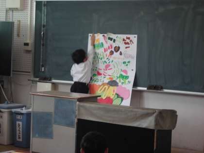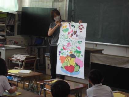 1年生 国語科「サラダでげんき」を学習したあと、みんなでどんな食べ物をサラダにいれたらいいか考えました。今日は、みんなで考えたサラダを完成させる授業です。いろいろな具材が入ったサラダができました。