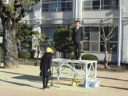 秋晴れの中、久しぶりに運動場で児童朝会が行われました。校長先生のお話です。