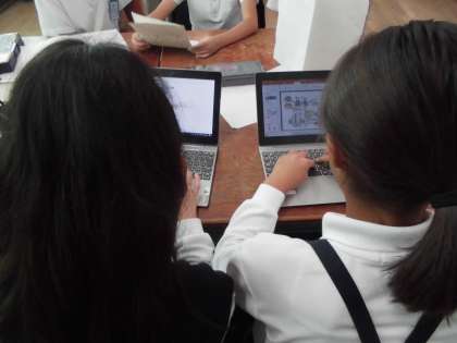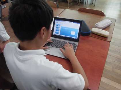 一人一台パソコンを使って、学習したことをパワーポイントで発表します。5年生はパワーポイントにあったセリフも自分たちで考えています。