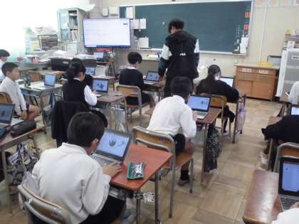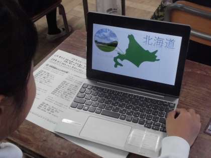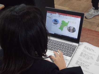4年生も一人一台パソコンを使って、いろいろな都道府県の調べたことをパワーポイントでまとめています。いろいろな効果を使って見やすい資料づくりができています。