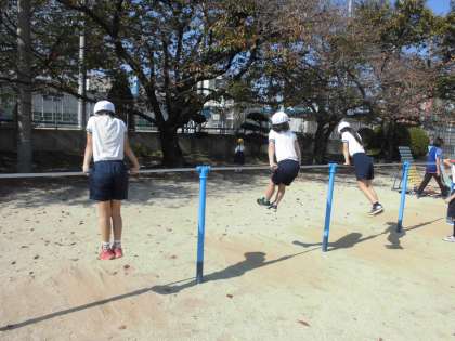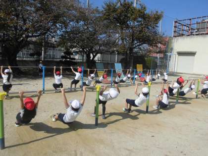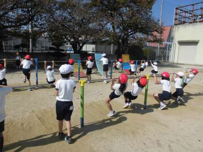 鉄棒運動です。ぶらさがりや腕で体を支持する感覚を養います。前回りや逆上がりの練習もしました。