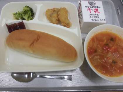 今日の給食は、白身魚のフリッター、ミネストローネ、ブロッコリーのサラダ、いちごジャム、コッペパン、牛乳です。フリッターとは、小麦粉や泡立てた卵白などで作った衣をつけて油で揚げたものです。ふっくらとした衣が特徴です。給食のフリッターは、衣に卵をつかってないので、卵アレルギーのあるひとも食べることができます。今日の給食の「白身魚のフリッター」は、「たら」を使っています。