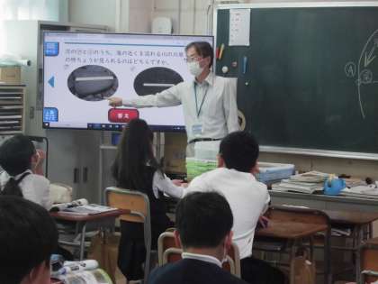 「流れる水の働き」の学習です。川の内側と外側では、水の流れの速さが違うため削られ方も変わってくる様子を確かめました。