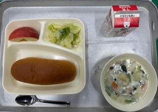 今日の給食は、黒糖パン、牛乳、きのこのクリームシチュー、キャベツのピクルス、りんごです。
