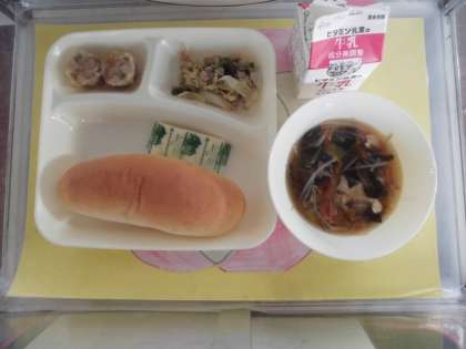 今日の献立は、コッペパン、焼きシューマイ、中華みそスープ、ツナと野菜のオイスターソースいため、ソフトマーガリン、牛乳です。