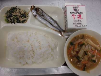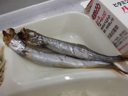 今日の給食は、焼きししゃも、みそ汁、こまつなのいためもの、ごはん、牛乳です。ししゃもは、北海道の太平洋側にすむキュウリウオ科の魚です。川で生まれ、海で1年半くらいかけて成長した後、10月〜11月ごろには再び川をさかのぼって卵を産みます。給食に使われているししゃもは、カラフトシシャモ(カペリン)と呼ばれる魚です。