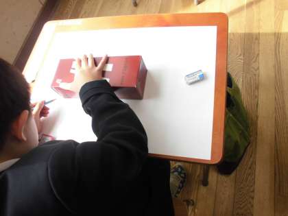 今日の学習は、「はこのかたちをうつしとって、えをかこう」の学習です。まるの箱、四角の箱 どの箱で、どんな絵を描こうかな!?を想像して、今日は箱の形の型をうつしました。