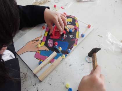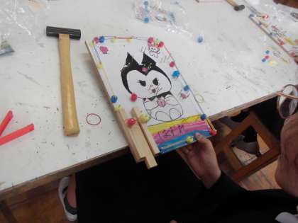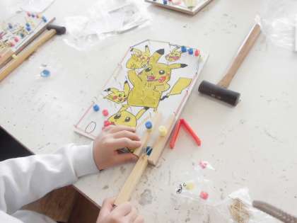くぎうちトントンもほぼ完成になってきました。出来上がった子どもたちは、実際に遊んでみて、ここに釘をうとうか?ここの釘は抜こうかな?など、さらに工夫を重ねています。
