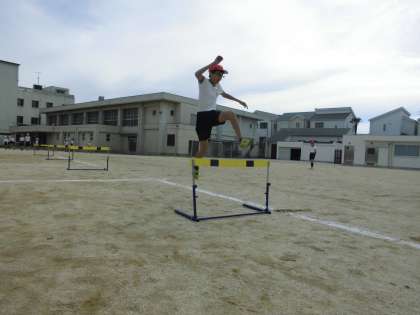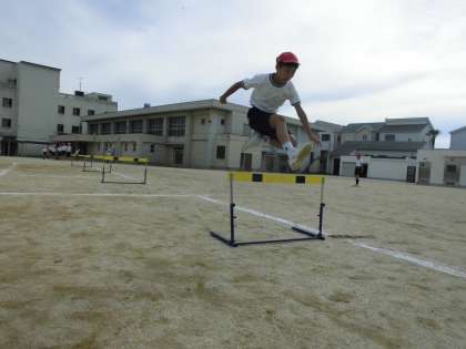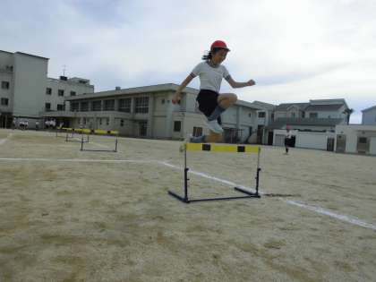 今日の体育は、なわとびとハードルの学習でした。ハードルの間と間のリズムを崩さずに、一定の歩数でハードルを飛び越すことをめあてに頑張りました。