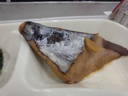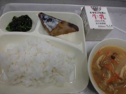 今日の給食は、なまりぶしのしょうが煮、なめこのみそ汁、ほうれんそうのごまあえ、ごはん、牛乳です。なまりぶしは、かつおの身を蒸して干したものです。赤のグループの食べ物で、主に体を作る働きがあります。たんぱく質のほかに、鉄やビタミンB群、ビタミンDなどが含まれています。