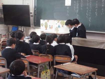 図書委員会さんが拡大絵本を持って1年生のところに読み聞かせに来てくれました。拡大の絵本でみんなとても見やすく集中してお話を聞けました。