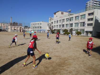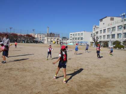 的あてゲームを行う前に、キャッチボールを行いました。ボールを複数使い、相手に向かって投げます。