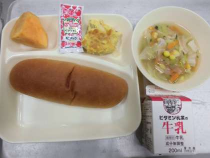 今日の給食は、ツナポテトオムレツ、スープ、かき(富有柿)黒糖パン、牛乳です。柿は、秋が旬(たくさんとれておいしい時期)の果物です。今日の給食に出てい「富有柿」(ふゆうがき)は、「甘柿」の一種で、丸形で、甘みが強いのが特徴です。「甘柿」のほかにも、渋をぬいてから食べる「渋柿」という種類もあります。