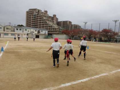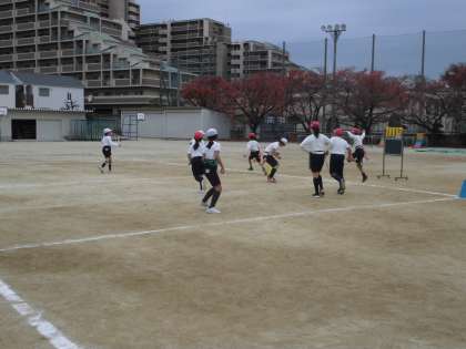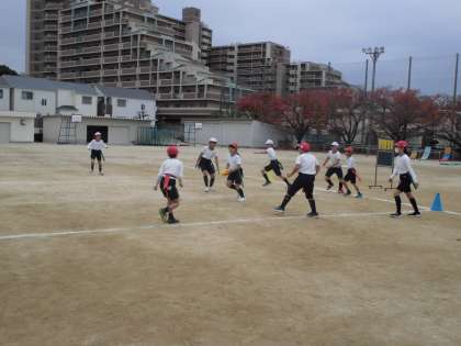 フラッグフットボールの学習です。チームで作戦を立ててゲームに取り組んでいます。
