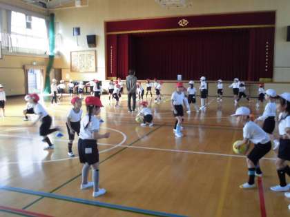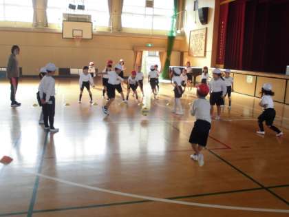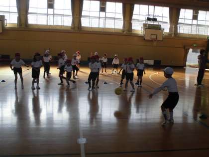 体育館で合同体育をしました。転がしドッジボールです。2つのボールが前や後ろから転がってきます。みんな上手に転がしたりよけたりできました。