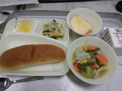 今日の給食は、ほうれんぞうのグラタン、スープ煮、りんご、マーマレード、コッペパン、牛乳です。ほうれんそうには、体の調子を整えるカロテンやビタミンCがたくさん含まれています。ほうれんそうの旬(たくさんとれる季節)は冬です。寒い時期のほうれんそうは、甘みが増してさらにおいしくなります。