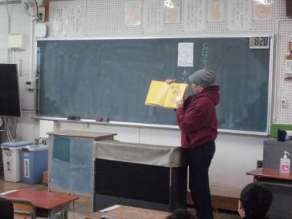 今日は、1年2組で「お〜しまい」の絵本を読んでいただきました。主人公の青いクマがもじもじしながら「おいら…」と黙った後、「ゲーップ」とゲップをする衝撃的な始まりからスタートするお話です。みんな大爆笑のお話でした。