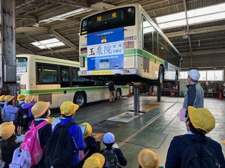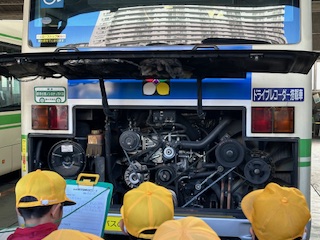 バスの機能やエンジン、点検する時にバスを上に持ち上げる様子を見学し、説明していただきました。