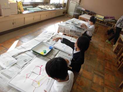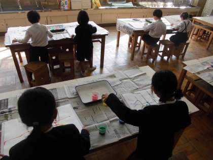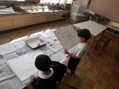絵の具をたらして、偶然にできる模様を描きました。次回の図工では、できた線や形から思いを広げて、パスを使って絵に表します。