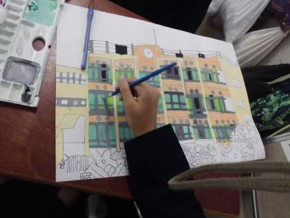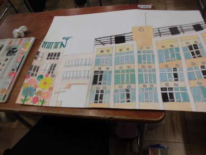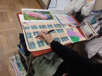 校舎の絵を描こう 校舎に花を添えて描いています。