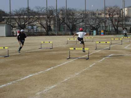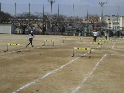 ハードル走の学習です。ハードルまでの歩数を意識して走りました。