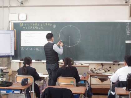 今日の算数は、「コンパスを使って、正六角形をかく方法を考える」が学習課題です。コンパスとノートのマス目を使いながら、正六角形を書きました。書き終えた後、正六角形の性質について確認しました。
