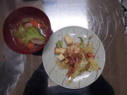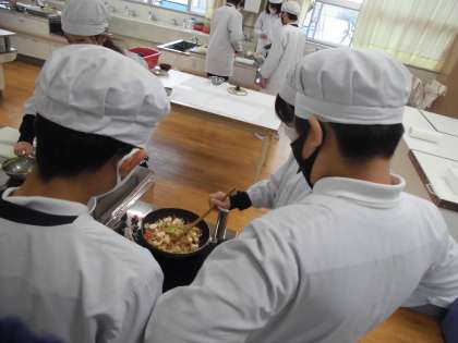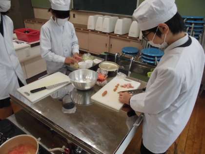 昨日に引き続き、別のクラスで調理実習が行われました。メニューは、とうふのチャンプルーとコンソメスープです。