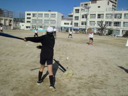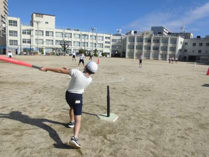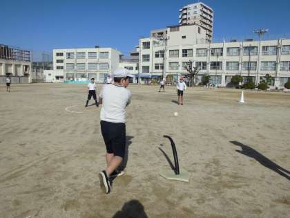5年生が運動場でTボールの学習をしています。力いっぱいバットを振ってかっ飛ばせ!!
