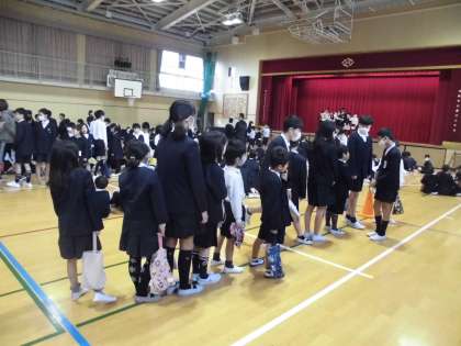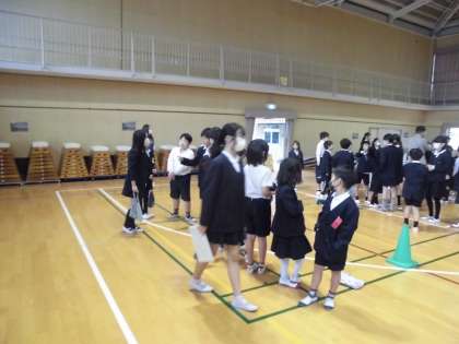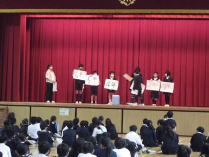 今日の児童集会は、「並び替えゲーム」です。集会委員の出すお題に、縦割り班を並び替えます。「誕生日順、出席番号順、学年順」など6年生を中心にいろいろな並び方で並ぶことができました。
