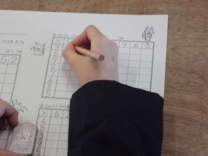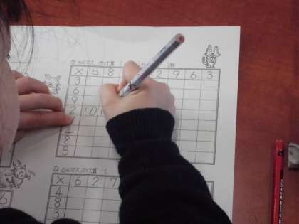 かけ算の九九の学習が終わり、今は速く正確に解けるように64マス計算に取り組んでいます。集中して取り組んでいる様子が伝わってきます。