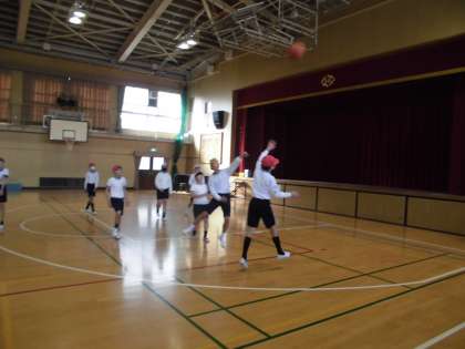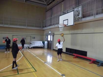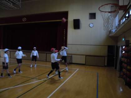 バスケットボールの学習です。チームで作戦を考えて試合の中で実行します。