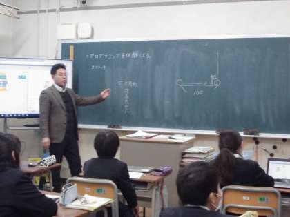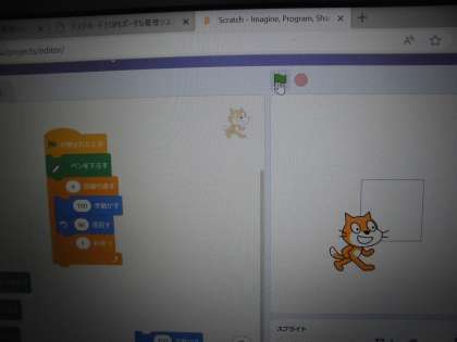 5年生 算数科では、プログラミングの授業です。児童用パソコンにある「スクラッチ」というアプリを使って正方形を描くにはどのような動きを作ればよいのかを考えました。無事に正方形を描くことができたのでしょうか!?